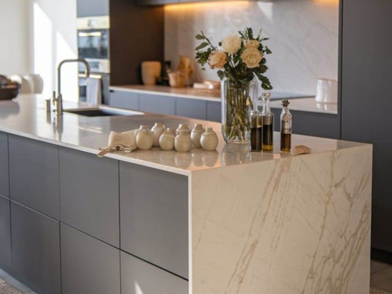 Marble (đá cẩm thạch) là loại đá tự nhiên nổi bật với vân đá đẹp mắt và vẻ đẹp quý phái. Tuy nhiên, so với granite, marble dễ bị trầy xước hơn và có thể bị ảnh hưởng bởi một số chất ăn mòn như axit. Mặc dù vậy, đá marble vẫn được nhiều gia chủ yêu thích nhờ vào vẻ đẹp tinh tế và khả năng tạo điểm nhấn cho không gian bếp.