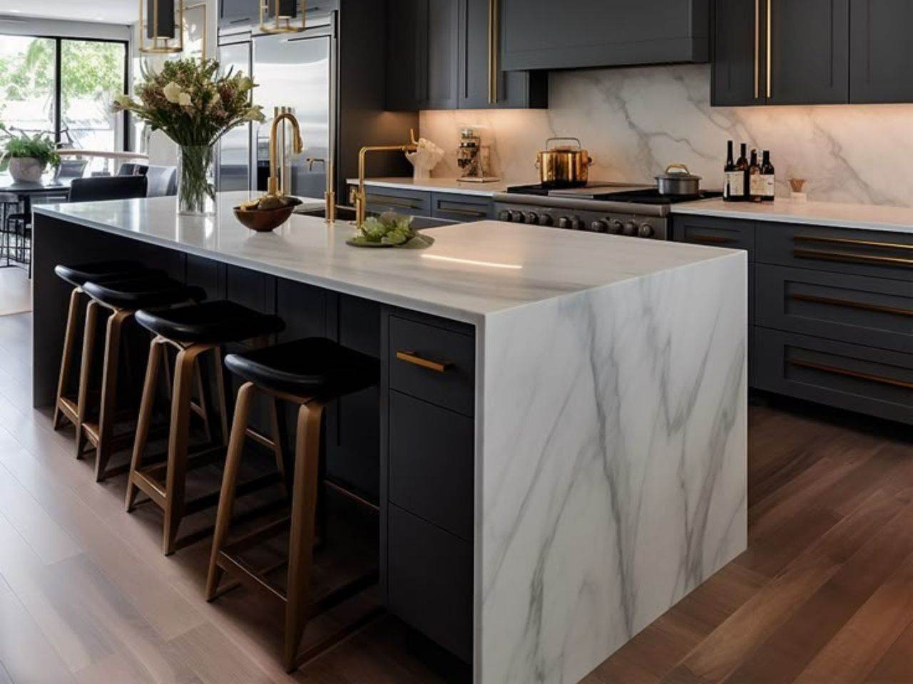 Đảo bếp kết hợp bàn ăn bề mặt đá là lựa chọn của nhiều gia đình yêu thích sự sang trọng và độ bền cao. Những ưu điểm nổi bật của mẫu thiết kế này bao gồm:
