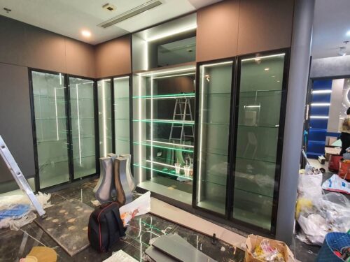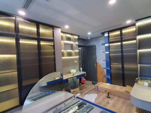 Cánh tủ kính khung nhôm: Phần cánh tủ sử dụng kính cường lực dày từ 5mm – 8mm, có khả năng chịu lực tốt, chống trầy xước và dễ dàng vệ sinh. Kính có thể là kính trong suốt, kính mờ, kính màu hoặc kính phản quang, tạo sự sang trọng và hiện đại cho không gian.
