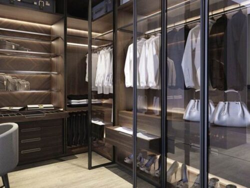 Tủ gỗ công nghiệp cánh kính trong suốt, hiện đại