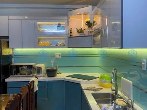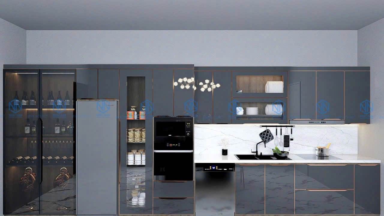 Cánh cửa tủ bếp được làm từ khung nhôm hợp kim kết hợp kính cường lực dày khoảng 5mm, có khả năng chịu lực tốt, chống trầy xước và không bị ảnh hưởng bởi nhiệt độ cao. Phần mặt sau kính thường được sơn màu theo yêu cầu của khách hàng, giúp tạo điểm nhấn thẩm mỹ và dễ dàng kết hợp với phong cách thiết kế của không gian bếp. Tay nắm cửa được thiết kế đúc liền với viền nhôm, giúp đảm bảo độ bền và tránh hư hỏng trong suốt quá trình sử dụng. Các cạnh của tay nắm được bo tròn một cách tinh tế, không chỉ mang lại vẻ đẹp thẩm mỹ mà còn đảm bảo sự an toàn khi sử dụng.