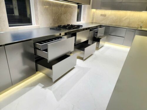 Tủ bếp Inox cao cấp không chỉ mạnh mẽ về độ bền mà còn tinh tế về thiết kế. Sản phẩm có thể kết hợp với mặt đá tự nhiên, kính cường lực, gỗ công nghiệp phủ acrylic hoặc laminate, tạo nên vẻ đẹp sang trọng, hiện đại và đẳng cấp.