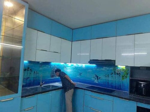 Mẫu tủ bếp nhôm lá ghép màu xanh đẹp, hiện đại