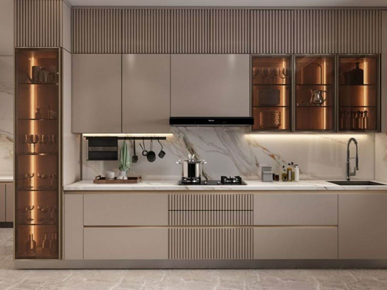 Cánh tủ có thể làm bằng nhựa Pima phủ lớp laminate, acrylic hoặc sơn PU tùy theo phong cách thiết kế. Bề mặt cánh bóng mịn, dễ lau chùi, có khả năng chống trầy xước và giữ màu tốt theo thời gian.