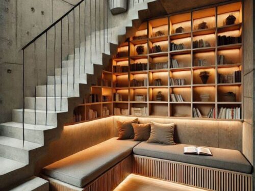 Kệ sách dưới gầm cầu thang không chỉ có công dụng lưu trữ sách mà còn là điểm nhấn trang trí độc đáo cho không gian sống. Bạn có thể thiết kế tủ kệ sách bằng gỗ công nghiệp để tận dụng khoảng trống dưới cầu thang, tạo nên một khu vực thư giãn lý tưởng, vừa ngăn nắp lại vừa đẹp mắt. Kệ sách cũng có thể được kết hợp với các ngăn kéo để đựng đồ dùng khác như tài liệu, hồ sơ.