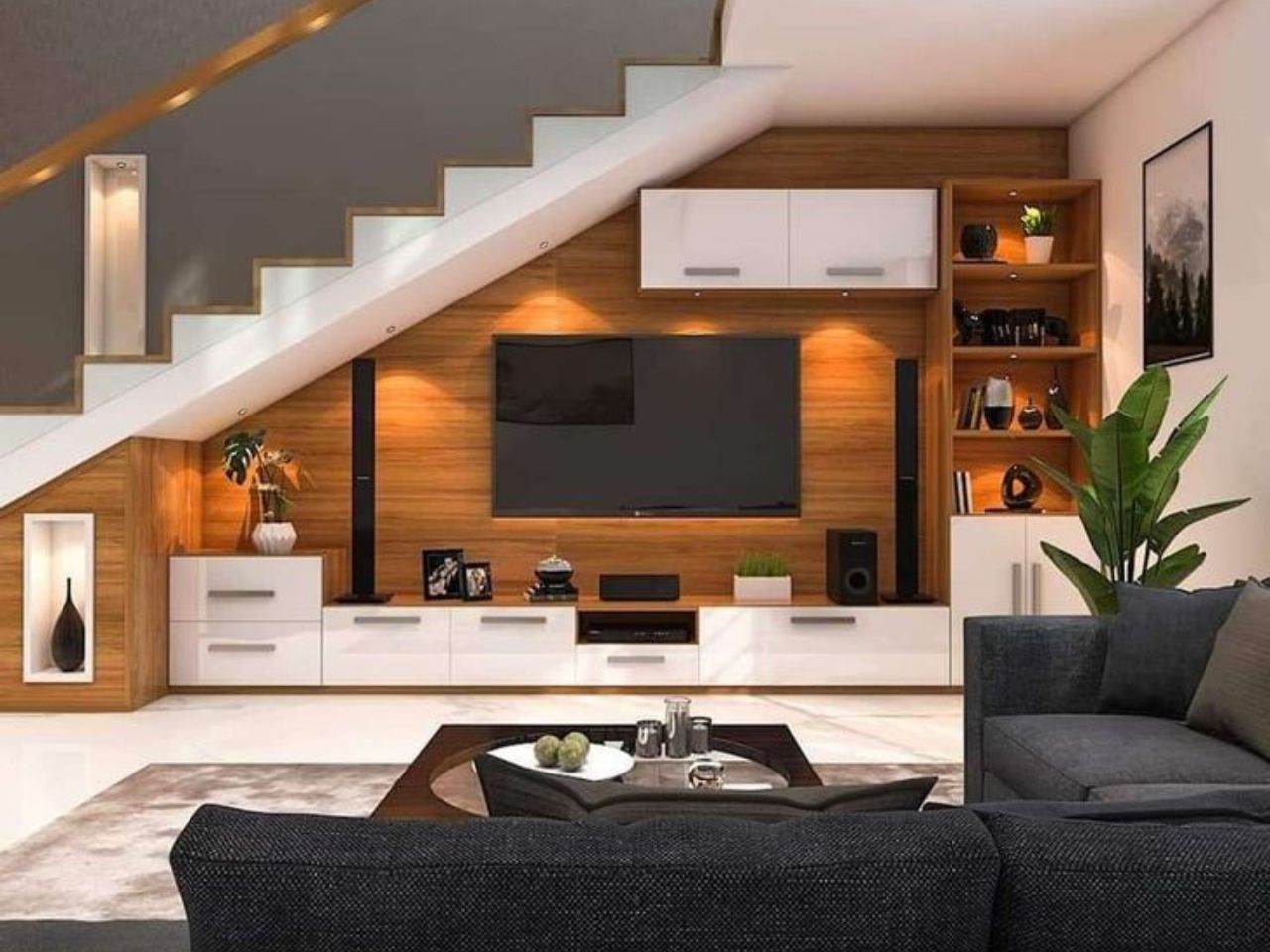 Một trong những ứng dụng phổ biến nhất của tủ gầm cầu thang gỗ công nghiệp là sử dụng làm kệ tivi dưới cầu thang. Tủ này không chỉ giúp tiết kiệm diện tích mà còn là nơi lý tưởng để bạn đặt tivi và các thiết bị điện tử. Thiết kế kệ tivi gầm cầu thang gỗ công nghiệp có thể được gia công với các ngăn kéo hoặc các kệ mở để tiện lợi trong việc lưu trữ các thiết bị khác như đầu DVD, máy chơi game, hoặc sách vở.