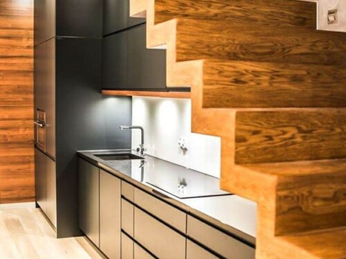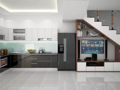 Nếu không gian bếp nhà bạn gần cầu thang, thì việc thiết kế tủ bếp gỗ công nghiệp gần cầu thang là một giải pháp hữu hiệu. Bạn có thể thiết kế tủ bếp tích hợp cùng tủ cầu thang để tận dụng diện tích, đồng thời tạo ra một không gian bếp gọn gàng, ngăn nắp và đẹp mắt. Tủ bếp này cũng có thể được tích hợp các ngăn kéo hoặc các kệ đựng đồ dùng nhà bếp.