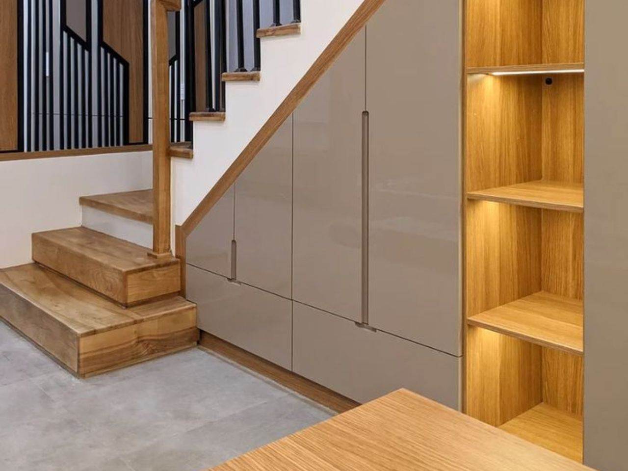 Với những gia đình có không gian bếp nhỏ hoặc phòng ăn kết hợp với phòng khách, tủ cầu thang gỗ công nghiệp có thể được thiết kế để đựng các món đồ dùng, bát đũa hoặc dụng cụ nhà bếp. Tủ này giúp bạn giữ cho không gian nhà bếp gọn gàng, ngăn nắp, đồng thời không làm mất đi tính thẩm mỹ của căn phòng.