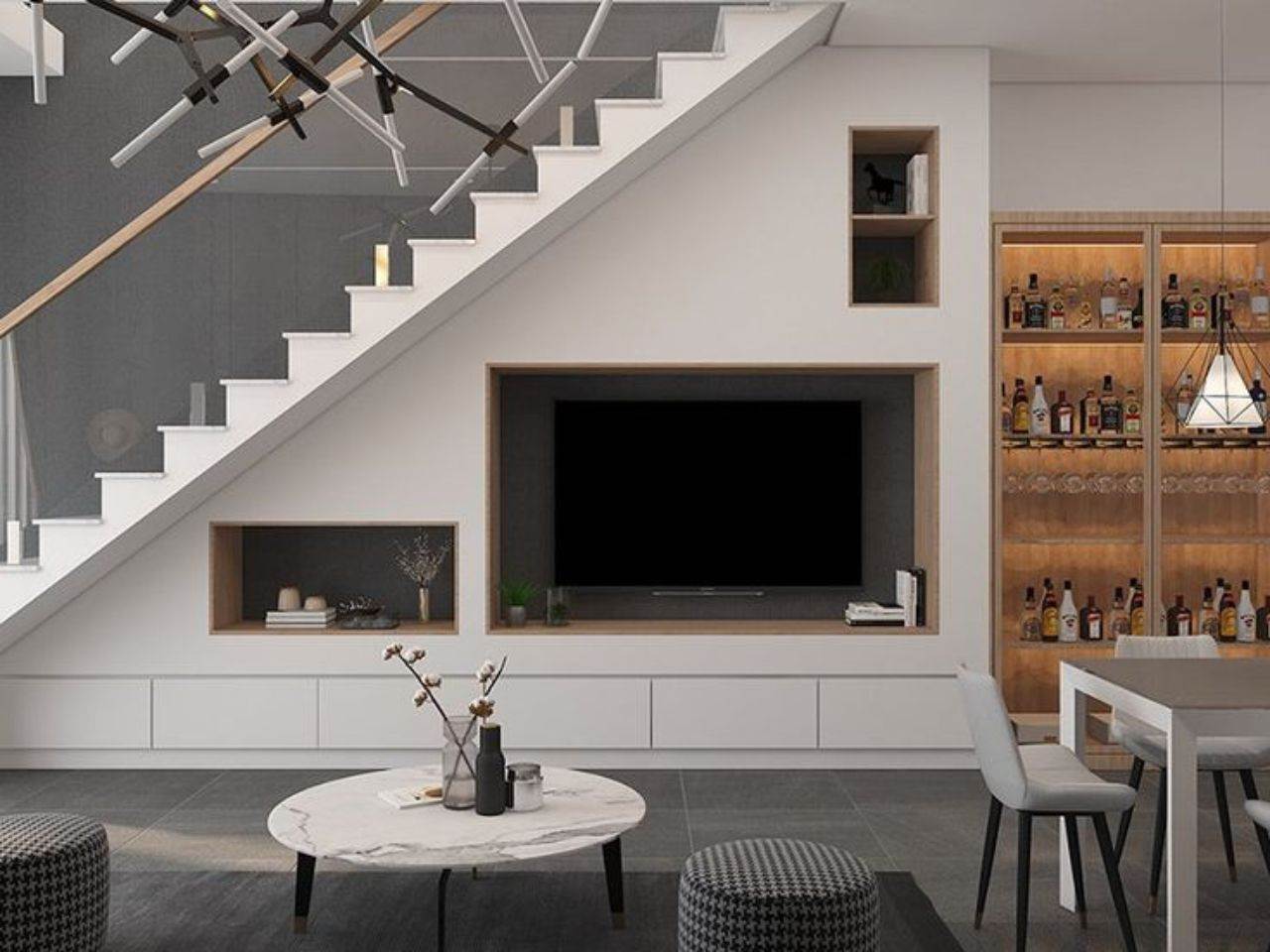 Không chỉ là nơi lưu trữ rượu, tủ gầm cầu thang có thể được tích hợp thêm các kệ trang trí. Những kệ này có thể dùng để trưng bày các vật phẩm yêu thích, sách báo, hay những món đồ trang trí nhỏ xinh, làm tăng tính sinh động cho không gian.
