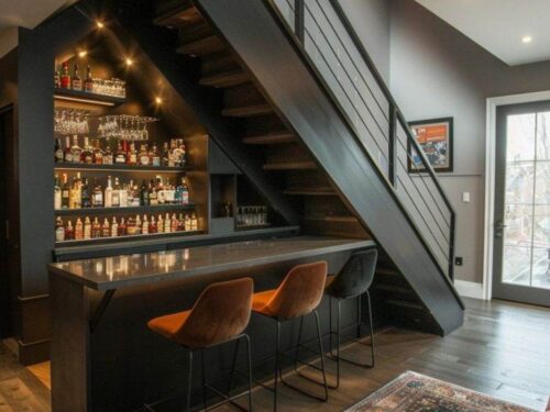 Đối với những không gian rộng rãi hơn, bạn có thể thiết kế tủ rượu kết hợp với quầy bar mini dưới gầm cầu thang. Đây là lựa chọn hoàn hảo cho những gia chủ yêu thích sự giao lưu, tiếp khách. Một quầy bar mini cùng bộ sưu tập rượu đẹp sẽ tạo ra không gian ấm cúng, sang trọng, lý tưởng cho những buổi tiệc nhỏ hay các cuộc gặp gỡ bạn bè.
