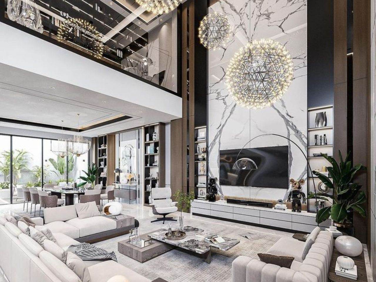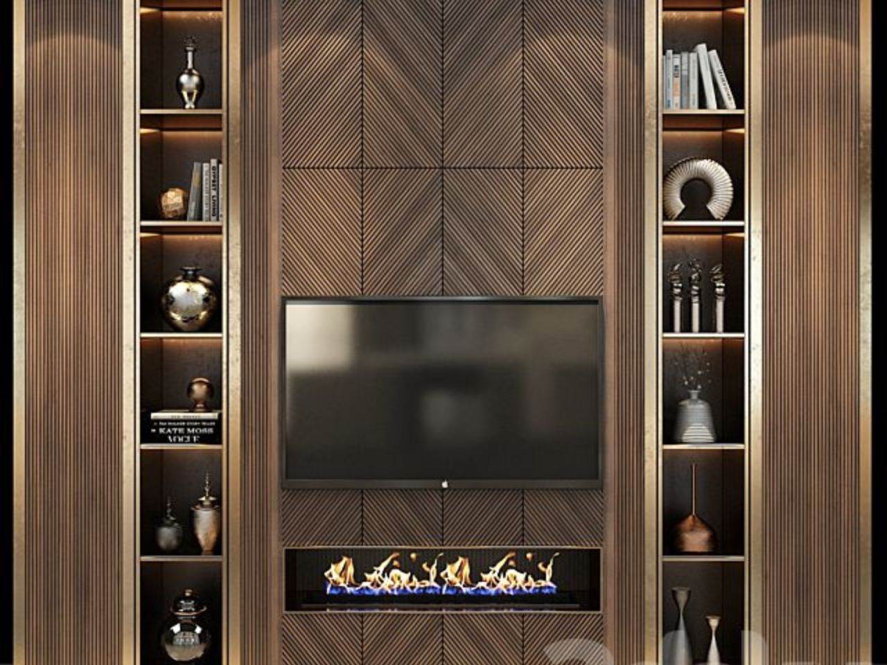 Với không gian rộng lớn của phòng khách, vách tivi tân cổ điển thường có thiết kế lớn, sang trọng, có thể kết hợp với các kệ để đồ, tủ trưng bày. Mẫu vách tivi này không chỉ tạo sự nổi bật cho không gian mà còn giúp bạn tổ chức phòng khách gọn gàng, tiện nghi hơn.
